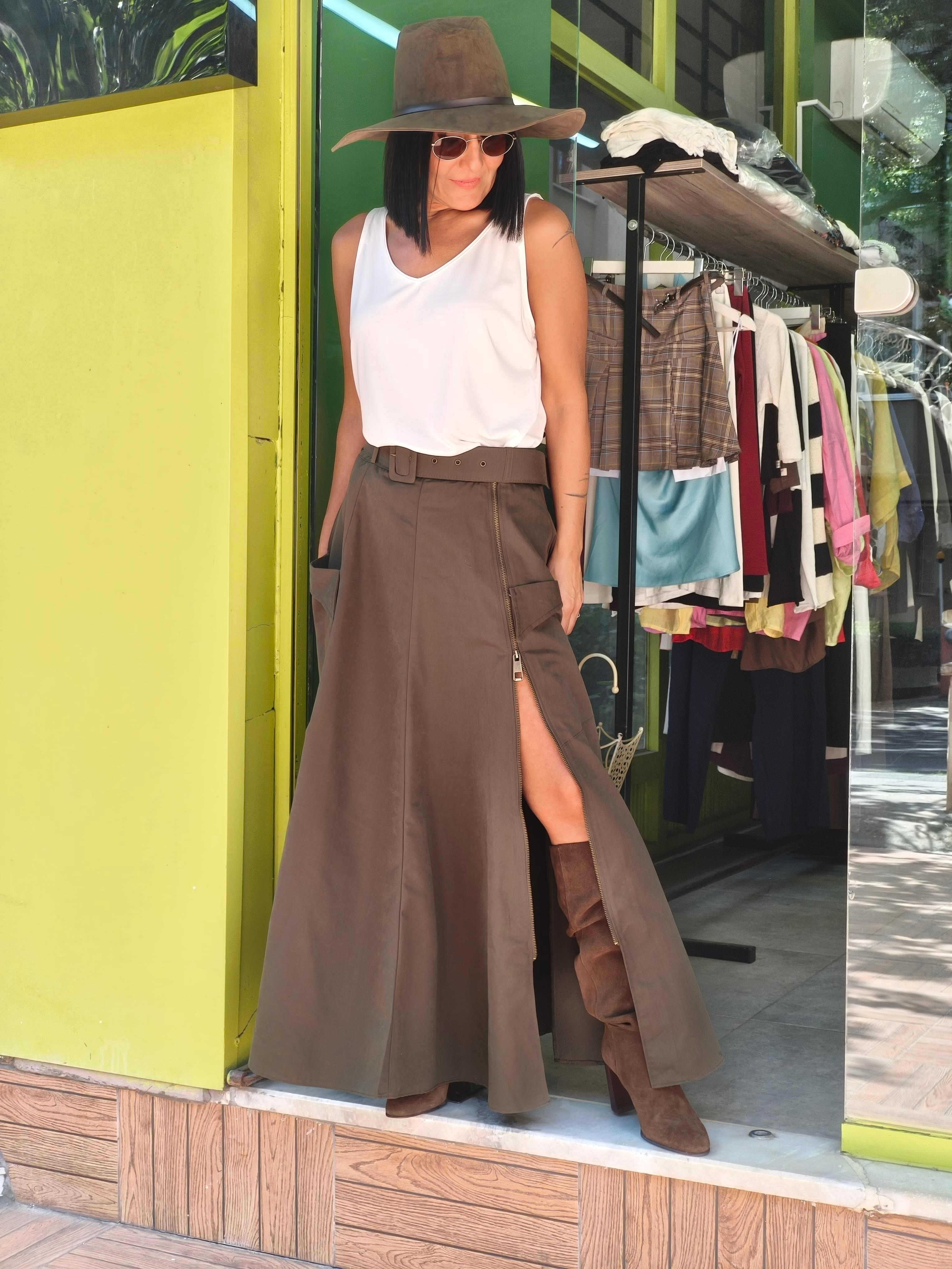 Kloş,Cotton,Önden Torba Cepli,Kemerli,Boydan Boya Fermuar Yırtmaçlı Etek